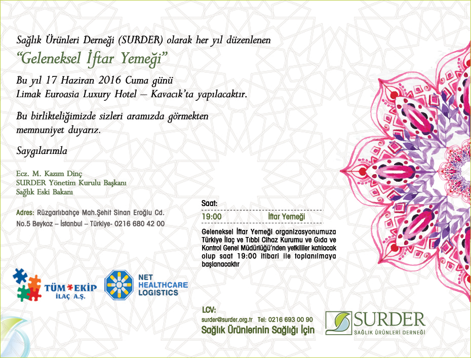 surder2017-05-22T07:32:56+00:00Her yıl düzenlenen geleneksel iftar yemeğimiz 17.06.2016 tarihinde Limak Euroasia Luxury Hotel’de Dernek Üyelerimiz ve TİTCK Başkan Yardımcısı Dr. Hakkı GÜRSÖZ, Serhan GENCER’in de katılımlarıyla gerçekleşmiştir.